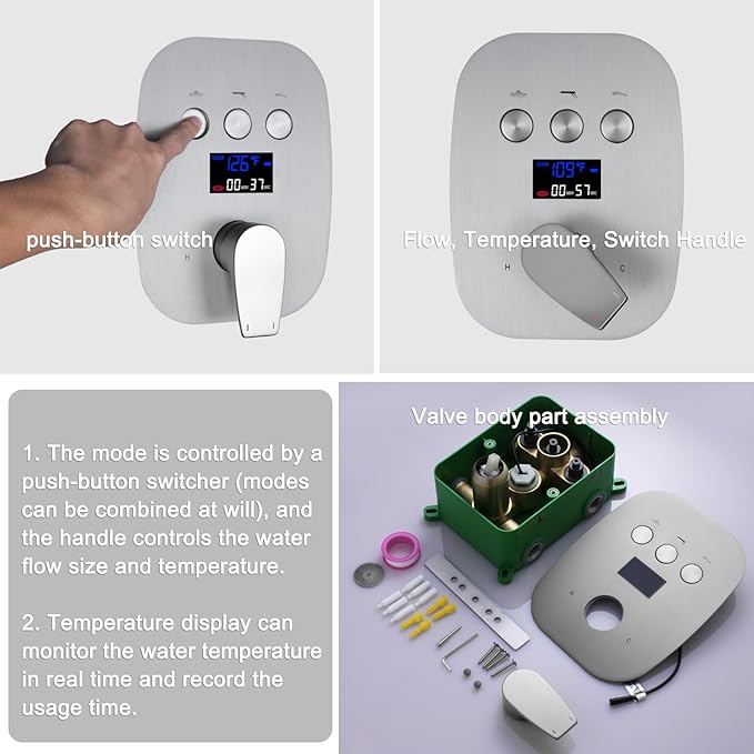 - Real-Time Temperature Display (°F): Instantly see water temperature and Shower usage duration on the digital display – no more guessing(no batteries needed)