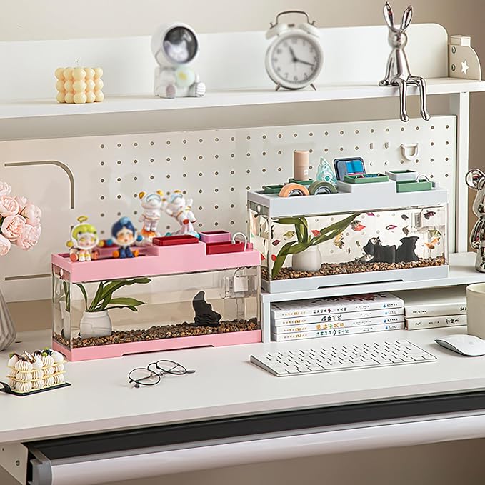 - 【Versatile Use】The top cover has multiple storage compartments, which can be used to store daily necessities, keeping the countertop clean and tidy. The fish tank also comes with three charging ports, making the fish tank convenient to power water pumps or provide emergency charging for digital products.