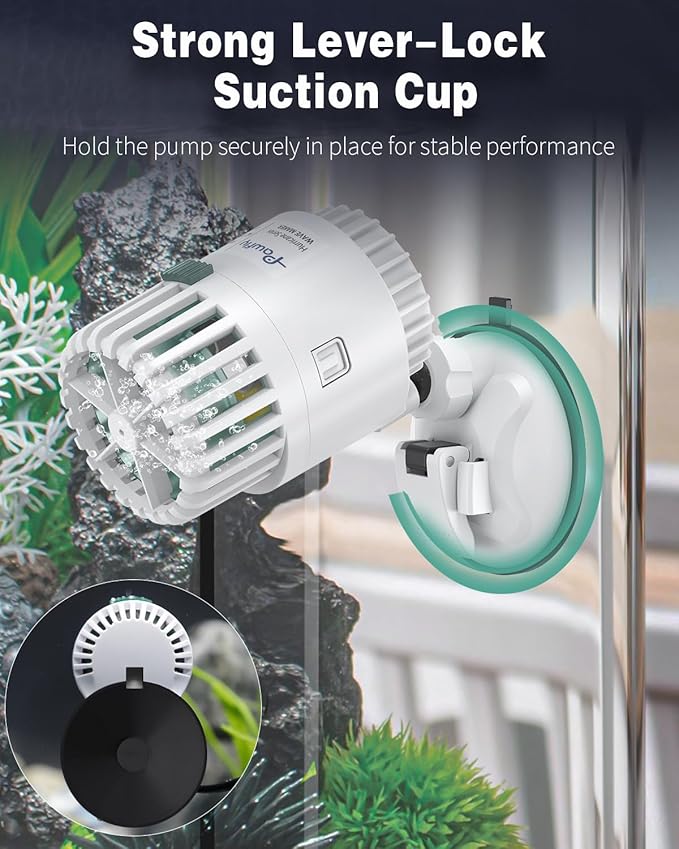 - Strong Suction Cup: Featuring a strong lever-lock suction cup base, this circulation pump stays firmly secured to any tank wall. Deliver consistent power that stirs the entire tank, mimicking turbulent sea waves and revitalizing your aquatic environment