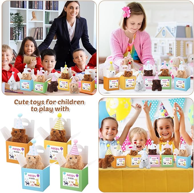 - Sufficient Quantity: you will receive 20 mini plush dogs in 4 colors, 20 birthday hats with fur balls and 20 carrying paper boxes printed with adopt a pet, you can put a cute hat on each plush dog or put them in the box, sufficient quantity will meet your various needs