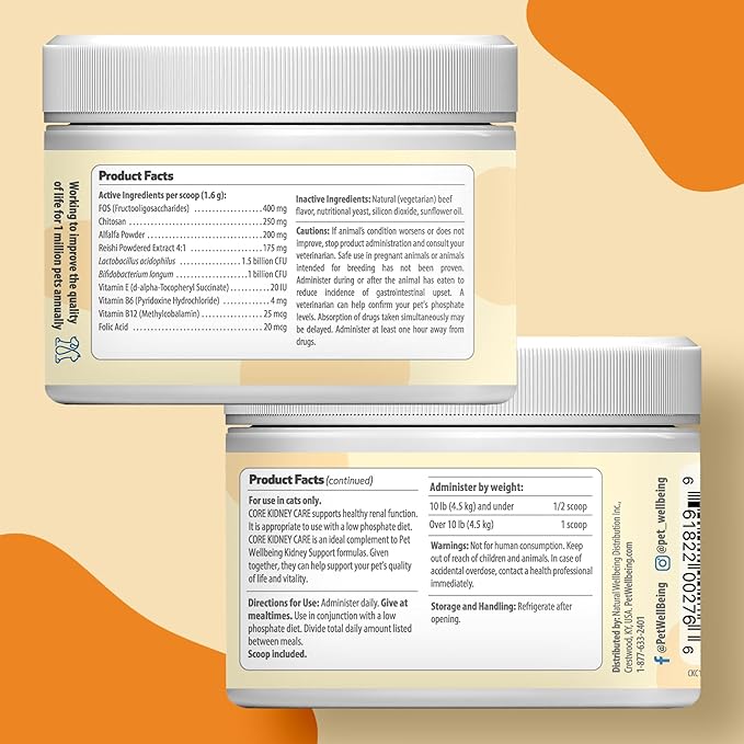 Pet Wellbeing Core Kidney Care for Cats - Daily Phosphate Binder, Supports Healthy Kidney Function with FOS, Chitosan, Probiotics - Veterinarian-Formulated 5.08 oz (144 g) Powder