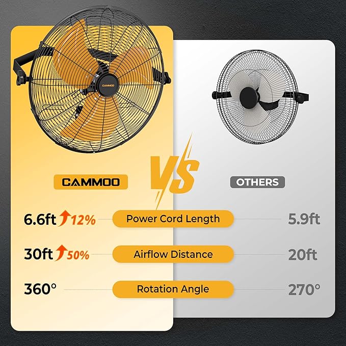 - Effortless Control with Extended Reach:Featuring a 6.6 ft power cord (12% longer than others), this wall mount fan effortlessly covers most distance needs, allowing you to enjoy cool airflow without extra wiring hassle. Ideal for industrial fan setups prioritizing convenience and flexible placement.