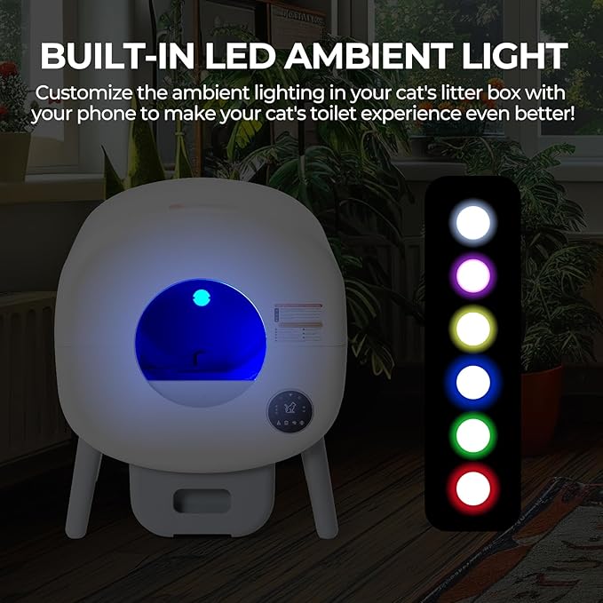 - Ultra-Quiet, Multi-Litter Compatibility & Modern Comfort: Runs at a whisper-quiet 35dB to avoid disturbing your home. Compatible with most clumping cat litters (excluding crystal or pine litter), and includes an advanced filter system for efficient odor control. Ambient LED lighting provides a soothing environment, making this a self cleaning litter box with low noise and elegant design for both cats and cat parents.