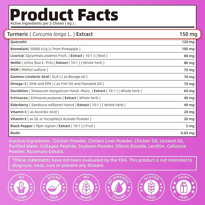 - Digestive Balance & Nutrient Absorption: To ensure your dog gets all the goodness from our skin comfotr and calming chews, we specially added with piperine which can enhance the absorption of active ingredients such as curcumin and quercetin
