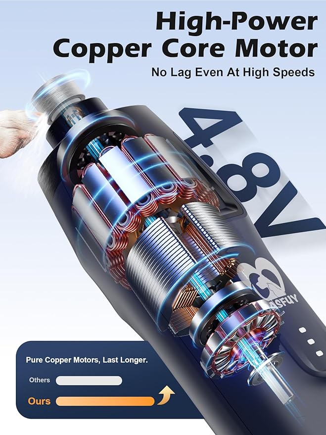 - 【4.8V Copper Core Motor - No Lag, More Power】Enhanced with 50% more torque, our powerful dog nail trimmer easily handles thick, tough nails. The durable copper core delivers smooth, stable grinding for an effortless grooming experience—even at high speeds—without stalling or slowing down.