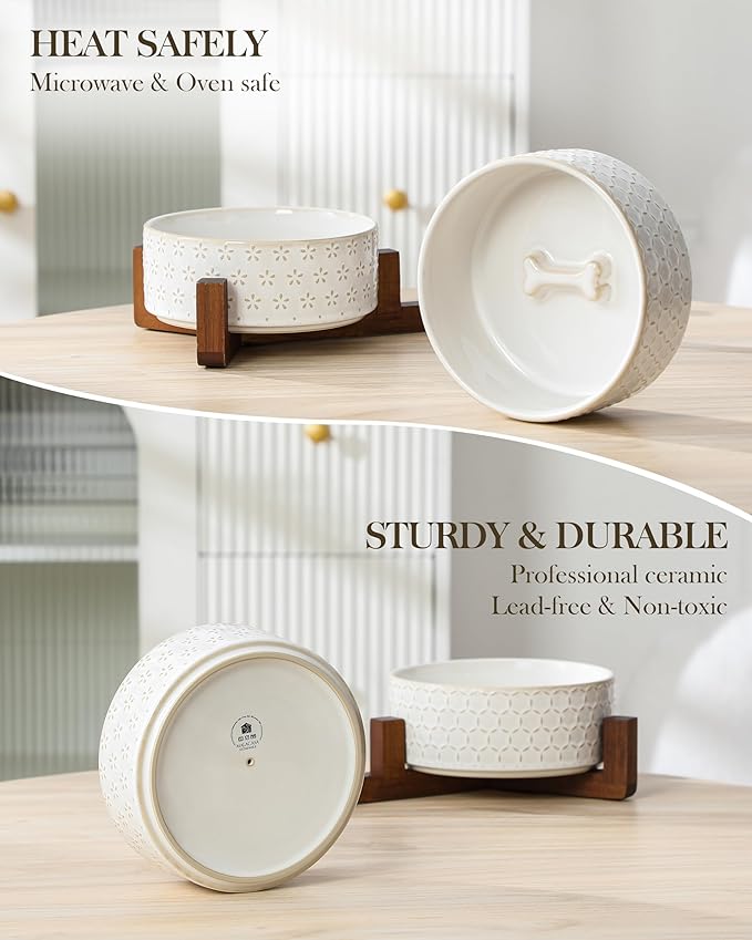 - 🦴【ELEGANT DESIGN】Featuring embossed Five-leaf Grass and Honeycomb patterns, paired with a stylish walnut wood stand for elevated dining. These ceramic dog bowls combines classic and modern styles to enhance its visual appeal. The cleverly designed dog bone-shaped decoration at the bottom adds both beauty and fun.
