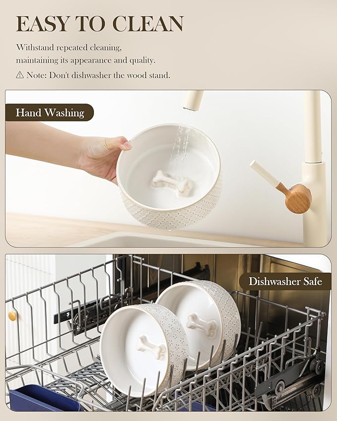 - 🦴【EASY MAINTENANCE】The ceramic bowls can be easily removed from the wooden stand for quick cleaning and convenient refilling. Featuring an active glaze finish, they are dishwasher safe and easy to clean by hand. Microwave safe as well, these bowls allow you to warm up your pet's food whenever needed.