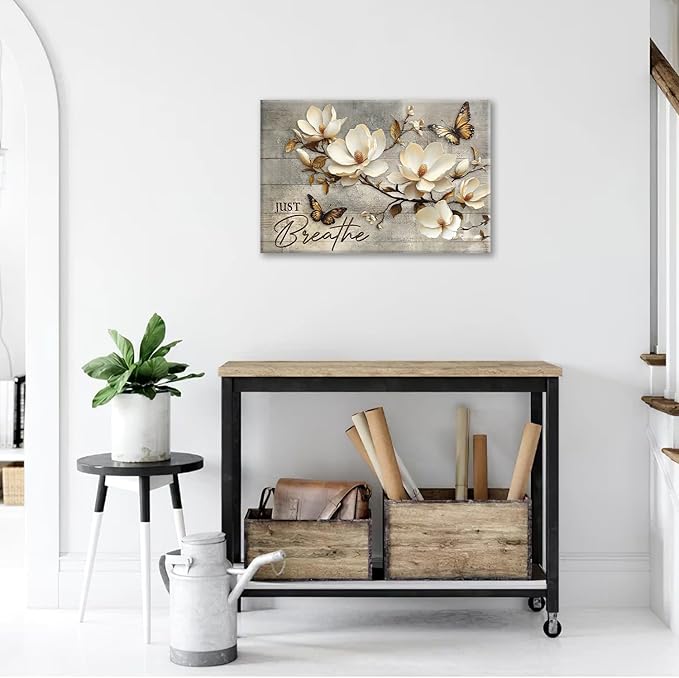 Floral Magnolia Bathroom Pictures Wall Art, Just Breathe Bathroom Wall Decor, Flower Butterfly Framed Painting Canvas Artwork for Bedroom Living Room Decorations 24"L x 16"W