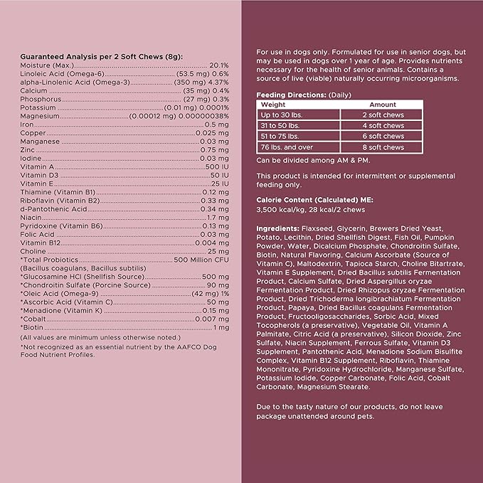 - Chew + Heal's senior dog multivitamin is a chewable supplement pack with vitamins, minerals, and probiotics to help your dog feel his best!