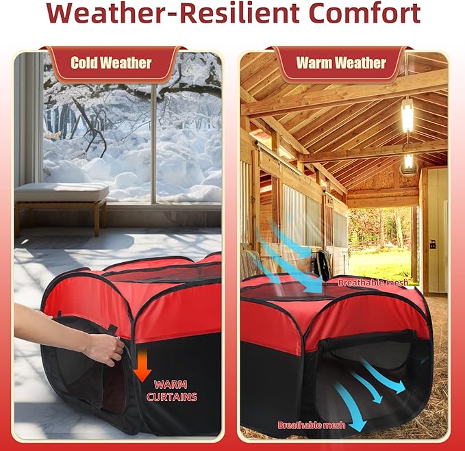 - [Weather-Resilient Comfort] - The insulated curtains and top cover provide excellent winter protection, keeping your chicks warm in cold weather. During warmer months, simply open the breathable mesh panels for optimal airflow - maintaining a cool, comfortable summer environment while securely containing your chicks.No matter the season, this coop heater brooder ensures your chicks stay safe, content, and perfectly comfortable in all weather conditions!