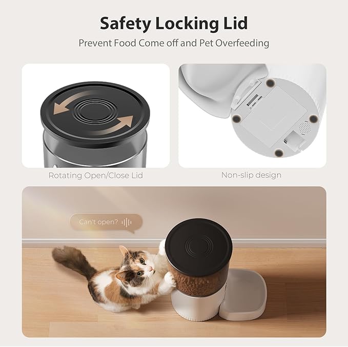 - SEALED SPACE WITH SECURE LOCKING LID: Does your cat often knock things over and throw them everywhere? The auto cat feeder's safety clasp locks the food storage bin tightly so your cat can't open it. Meanwhile, the 3L sealed dry food bucket keeps pet food crispy and delicious and away from moisture
