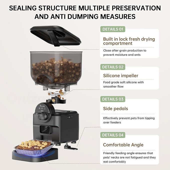 - App Remote Control with Stable 2.4G WiFi Programmable automatic feeding system simplified . Easily set up feeding times, portion sizes, and monitor your pet’s feeding history. Use the app to control portions, timed release schedule meals (up to 10 timed feeds/day with 1-12 portions per meal), Compatible with 2.4G WiFi (not 5G) for reliable remote access from your phone controlled or tablet.