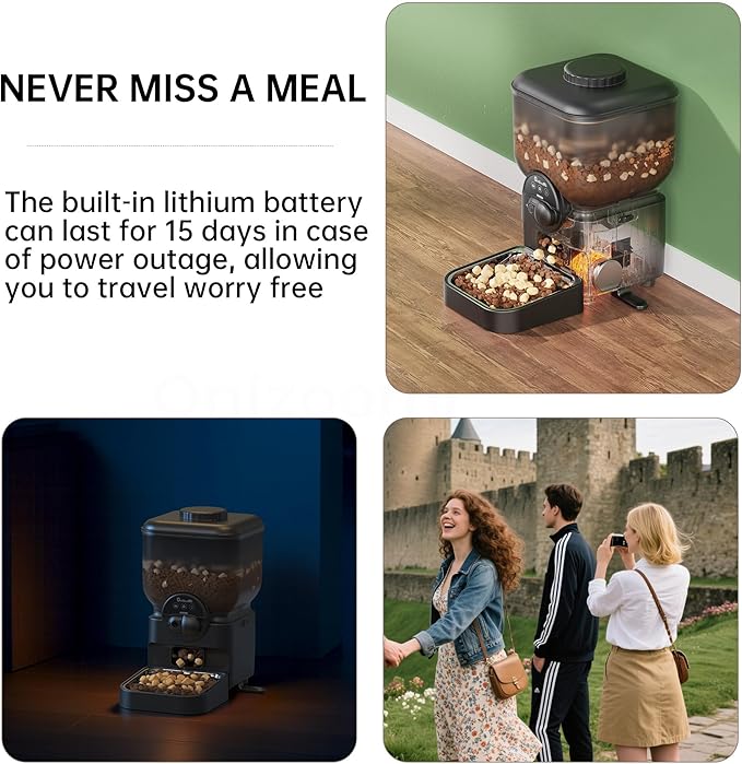 - Ensures Continuous Feeding with Dual Power Sources : USB and Rechargeable Battery This electric auto feeder uses dual power—USB or battery-backup operated (provides power supply for 15 days ). Ideal for outdoor/indoor use, power outages, on business trip or travel.The gravity-based dispensing system ensures a steady food delivery even during power outages.