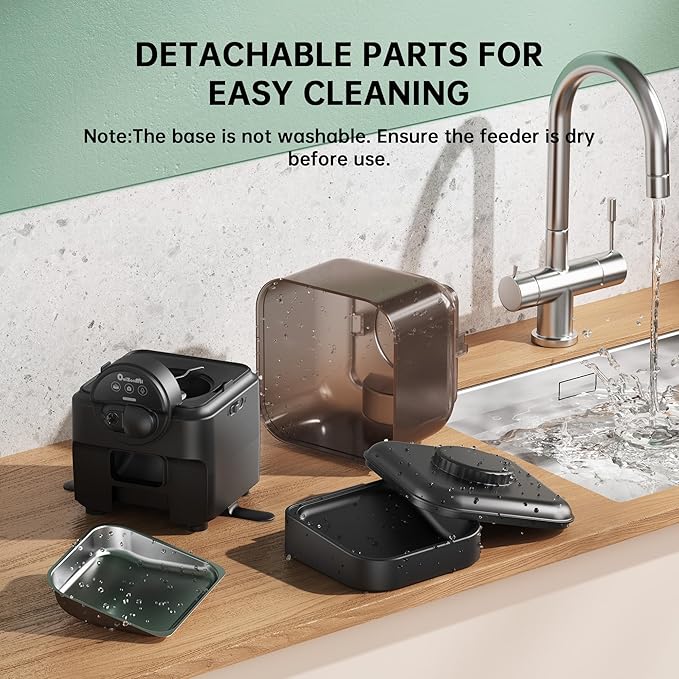 - Detachable Stainless Steel Bowl and Gravity-Assisted Dispensing Soft silicone outlet and gravity dispensing prevent clogs. Our removable stainless steel bowls feature a specially angled designed to encourage healthy feeding posture , aiding digestion for kitty, kittens and small dogs. The removable stainless steel bowl is easy to clean, but the main unit is not washable. Wipe the unit with a dry cloth to clean.