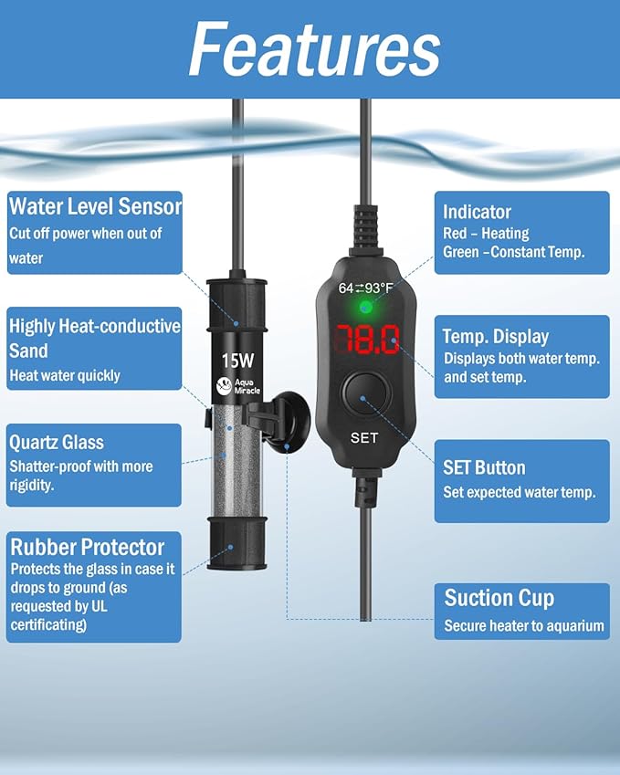 AquaMiracle Adjustable 15W Aquarium Heater Submersible Fish Tank Heater Super Short Aquarium Heater with LED Digital Display Thermostat, for Tanks 1-3 Gallons