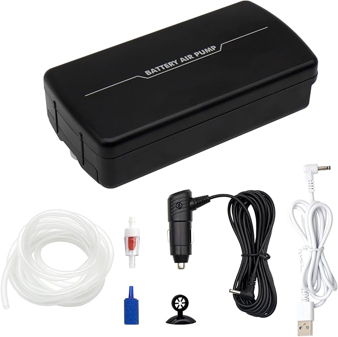 - [Packaging Content]: 1 x Aerator Pump For Bait Bucket;1 x Car Cigarette Lighter;1 x USB Charging Cord;1 x Air Stone;1 x Rubber Hose;1 x Check Valves;1 x Suction Cup;1 x User’s Manual