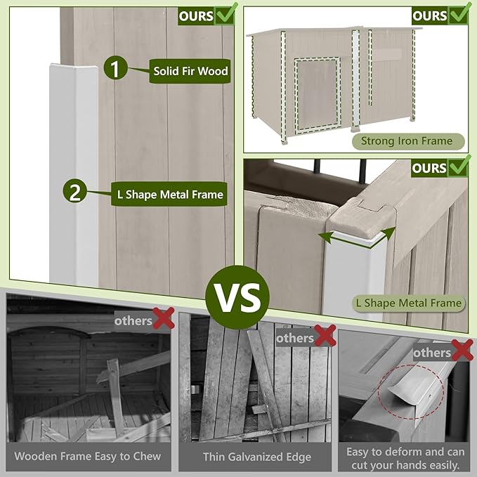 - 【DURABLE & CHEW-RESISTANT DESIGN】Crafted from solid fir wood and reinforced with a chew-resistant iron frame, this outdoor dog house resists cracking, warping, and biting. The sloped asphalt roof is weatherproof, preventing water and snow buildup to keep the interior dry. Built to last and protect your pet in any season.