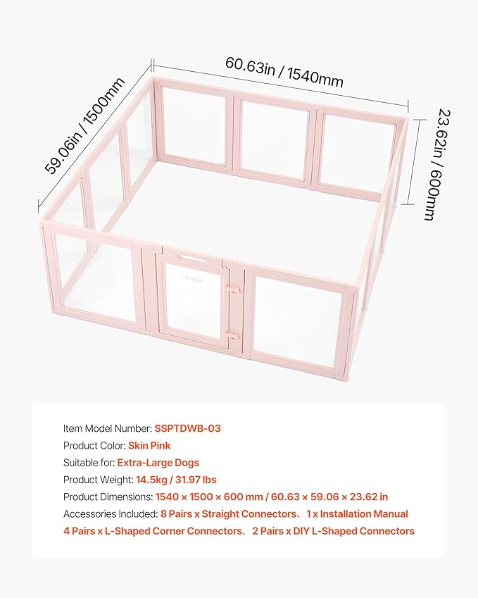 VEVOR Clear Acrylic Dog Playpen Indoor, 60x59x23 in Transparent Plastic Dog Playpen for X-Large Sized Dogs, Easy Assemble Waterproof Puppy Playpen, Easy to Clean,Durable Indoor Pet Dogs Cats Fence Kit