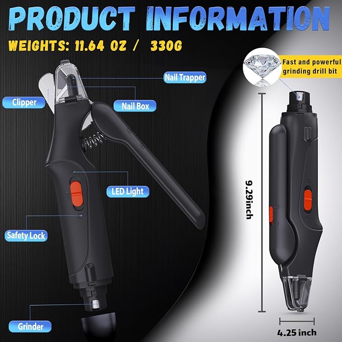 - Recommended Uses For Product : After fully charging, if you want to trim your pet's nails, push the switch on the 2-in-1 pet nail clippers upward. When trimming the nails, use the light to observe your pet's nails to avoid over-trimming. The other side is a pet nail grinder, which also allows you to observe your pet's nails using the light. After fully charging, if you want to trim your pet's nails, push the switch on the 2-in-1 pet nail clippers upward. When trimming the nails, use t… See more