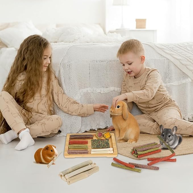 - Interactive Rabbit Enrichment Toys - Rabbit toys set rich in high fiber, effectively helps digestion and improve pet appetite. In addition to being delicious and beneficial to small animal denta health, bunny chew treats keep your pet active and away from boredom. Rabbit treats also enables the owner to enjoy the interaction with furry friends, as well as meet the rabbit's need for enrichment play, and promote the physical and mental health of rabbits.