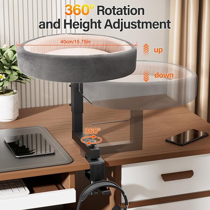 - [2-in-1 Cat Bed Desk Mount + Headphone Hanger] This versatile cat desk bed doubles as a headphone hanger, keeping your workspace tidy while your cat enjoys a cozy perch at your side. Perfect for pet-loving gamers or remote workers.