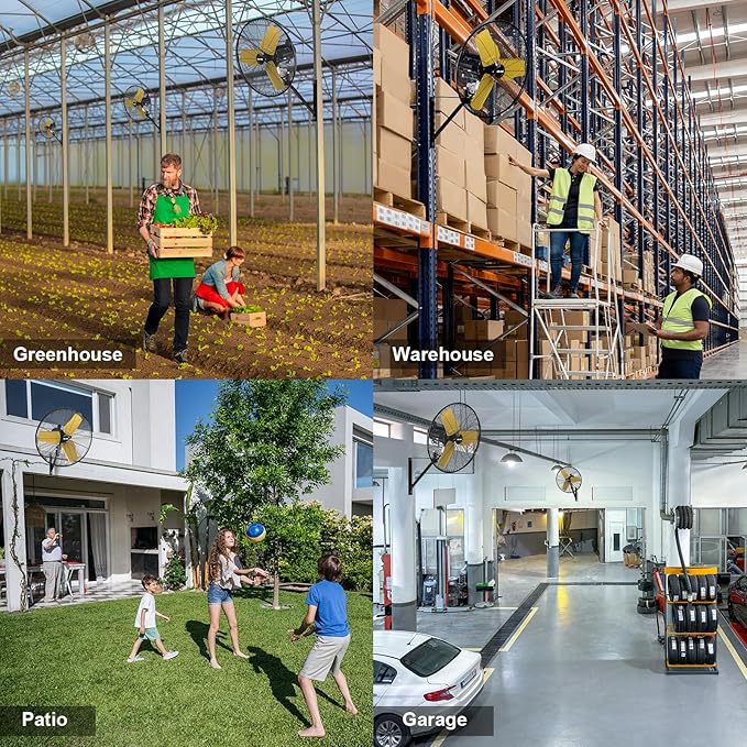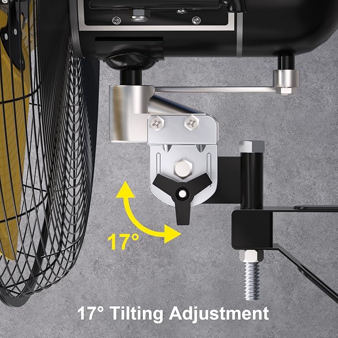 - Adjustable Tilting and Oscillation: Cool every corner with the fan's 80° oscillating airflow that moves back and forth. And with the option to 17° tilt or within it, achieve the better air placement for your comfort. So Just enjoy a cooling summer. This is an industrial wall mounted fan, the noise is louder than home fans, but less noisy than most of the same size industrial fans
