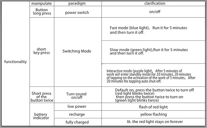 - 3 Smart Play Modes: Long press to turn on/off.Automatic cat toy offers three modes of adjustment: slow mode (blue light), fast mode (green light) and interactive mode (purple light),short press to switching working mode, and distinguish via the color of the light.Steady rolling, irregular jumps with bird sounds to cater to cats of varying energy levels and play styles. Auto-standby after 5 minutes of work, reactivated by touch or motion detection for energy efficiency and sustained engagement