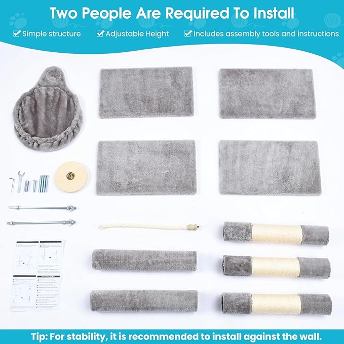 - Sturdiness and Stability: When installing, press down the main body of the cat tree as hard as you can, then rotate the rod up to the maximum length to withstand the ceiling and lock it until the cat tree no longer shakes.