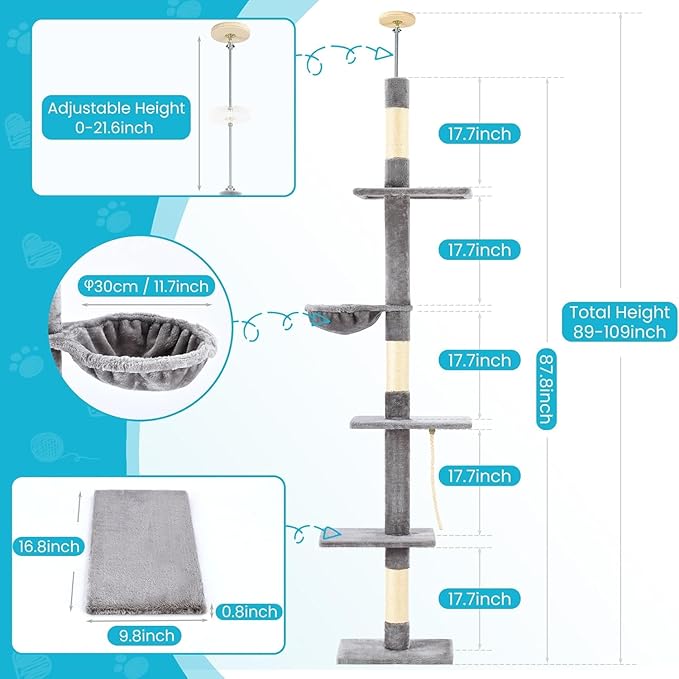 - Dimension: The main body of the cat tree is 87.8in high, and can be adapted to the ceiling of 89-109 in through splicing and adjustable screw rods. By utilizing the vertical space from floor to ceiling, this cat tree design optimizes space utilization. It's a great solution for cat owners who want to provide their cats with vertical enrichment while minimizing clutter.