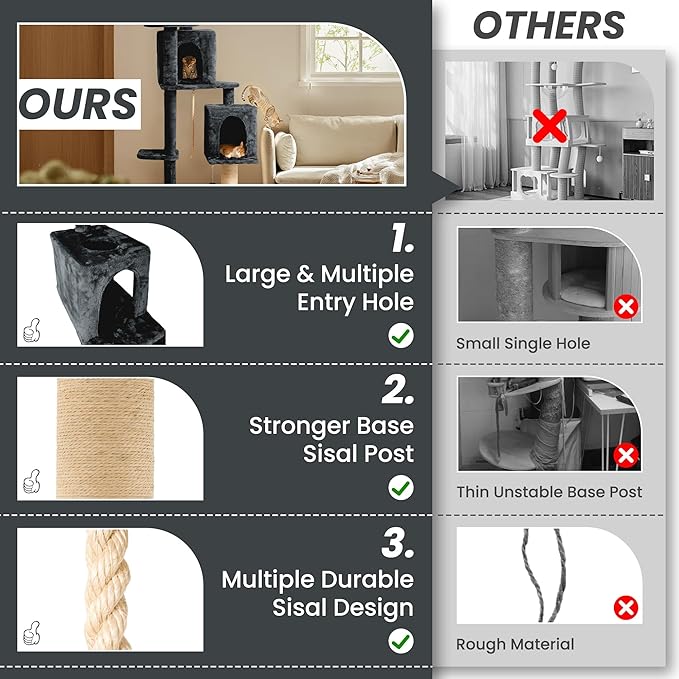 - ๐พ[Spacious and comfortable Design]: 59 inch ultra large size cat tree, equipped with two independent cat condos, providing ample space for multiple cats to move and rest.