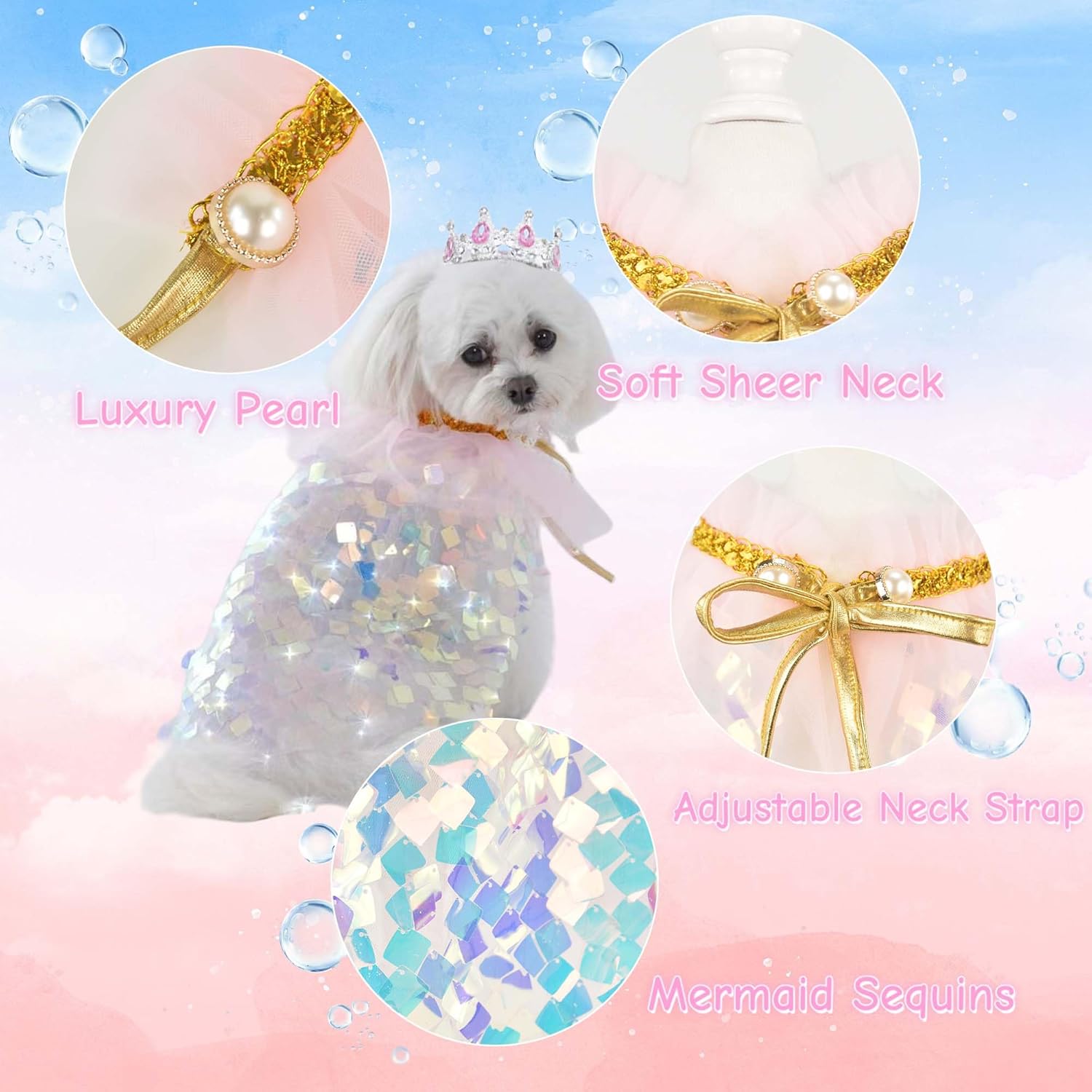Dog Princess Dress Costume with Rhinestones Crown,Pet Cat Cape Cloak Birthday Party Wedding Dress Up Outfits,Rainbow Mermaid Halloween Costume Clothes (X-Small to X-Large)